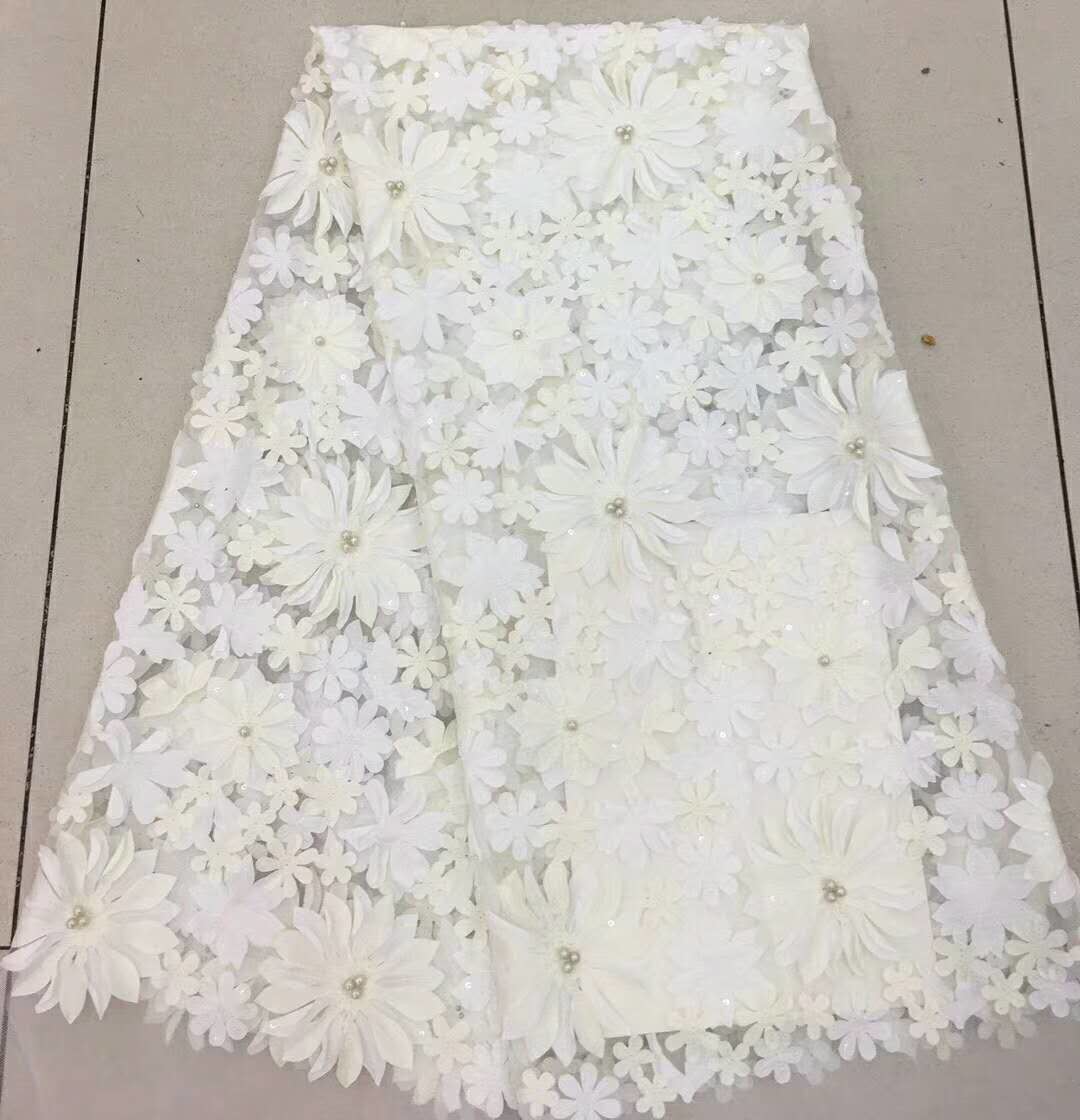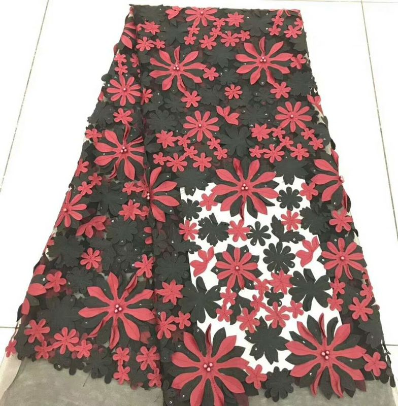 সূচিকর্ম সফ্টওয়্যার দিয়ে ডিজিটাইজ করা প্যাটার্ন ব্যবহার করে একটি কম্পিউটারাইজড এমব্রয়ডারি মেশিনের সাহায্যে ফুল, পুঁতি এবং সিকুইন সহ এমব্রয়ডারি করা জাল লেস কাপড়। মেশিন এমব্রয়ডারিতে, বিভিন্ন ধরনের "ফিল" সমাপ্ত কাজের টেক্সচার এবং ডিজাইন যোগ করে। লেইস ফ্যাব্রিক উপর হস্তনির্মিত জপমালা এবং sequins সেলাই. 3D ফুলের লেইস কাপড় পোশাক আনুষাঙ্গিক প্রসাধন, পোশাক, পোষাক, স্কার্ট, শিশুদের পরিধান, ইত্যাদি জন্য উপযুক্ত। 3D ফুল লেইস ফ্যাব্রিক ডিজাইন প্যাটেন প্রধানত ফুল এবং পাতা, সূক্ষ্ম এবং মার্জিত, নারীদের মধ্যে খুব জনপ্রিয় ছিল।